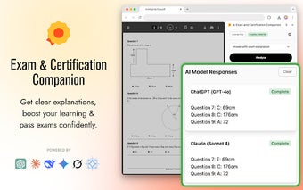 AI Exam and Certification Companion, Chrome tarayıcı eklentisi olarak, sınav ve sertifika sorularınızı AI ile analiz etmenize yardımcı olur. Kullanıcı dostu bir arayüze sahip olan bu eklenti, ChatGPT, Claude, DeepSeek, Grok ve Gemini gibi birçok AI modelinden gelen yanıtlarla öğrenme sürecinizi destekler. Çoktan seçmeli, açık uçlu, doğru/yanlış ve makale soruları gibi tüm soru türlerini desteklerken, tarayıcı tabanlı sınavlarda soruları otomatik olarak algılayarak yanıtlar sunar.